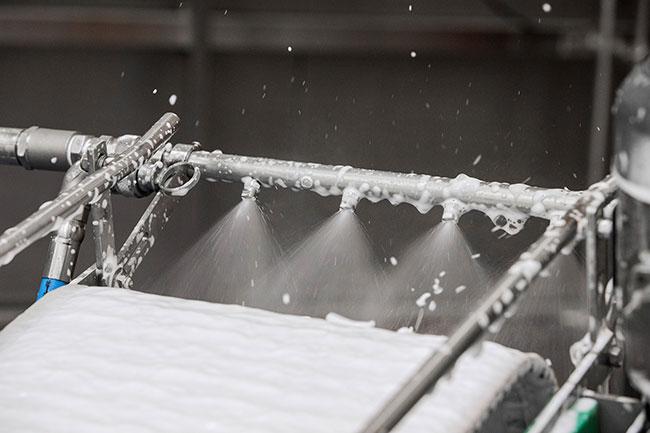 Les rampes de buses sont placées à des endroits stratégiques, à l'intérieur et à l'extérieur du convoyeur, afin de garantir que chaque centimètre de la bande est nettoyé et assaini pour éviter toute croissance microbienne. Le système est modulaire et peut être combiné pour répondre aux exigences de tous les types de convoyeurs.